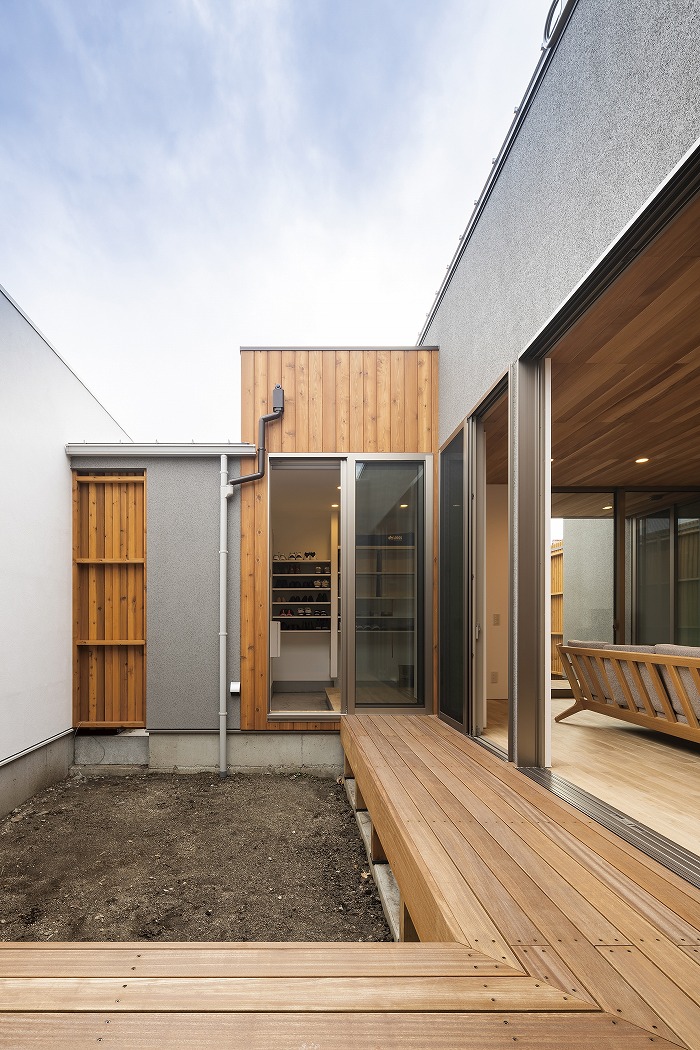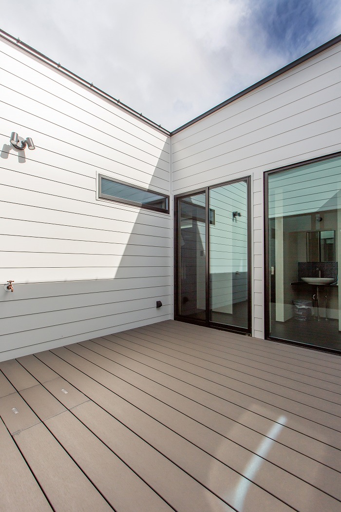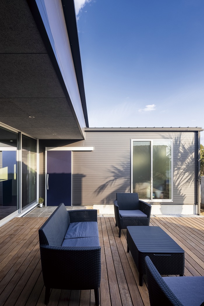 部屋をコの字形に配置することで家の中に心地よい光と風を取り入れました。タイル仕上げの開放感ある中庭は「家族がくつろげる」をコンセプトに子供たちの水遊びや休日のバーベキューに大活躍。用途は無限大です。