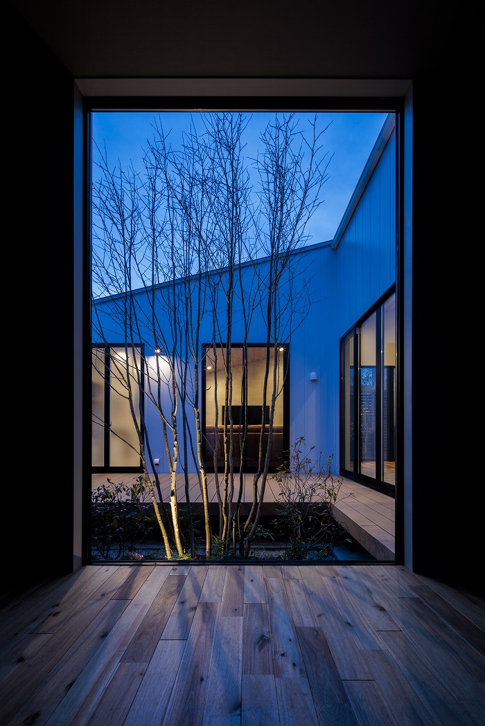 家の中央に配置された中庭が特徴的な家。採光性と通気性が確保できると同時に、カーテンがなくてもプライバシーが守られ、気持ちよく生活することができます。