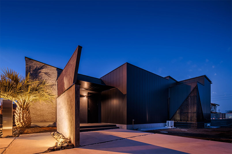 まるでギャラリーや一軒家レストランのようなクールな佇まいの平屋が完成しました。外観はテクスチャーの異なる外壁材を組み合わせ、大胆に斜めにカットした壁や室内の灯りがもれる格子がアクセント。シンボルツリーのココスヤシをライティングすると、壁面に浮かび上がる陰影が建物をより引き立てます。
