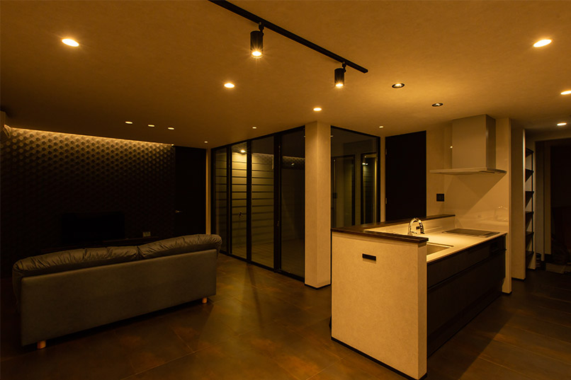 また、外部からの視線を遮るべく、中庭部分の壁の高さを調整し、カーテンの要らない生活を実現しました。外観の無機質な印象とは対照的に、キッチン部分にはコンクリート素材と木をふんだんに使い、シャープながら温かみのある空間とすることで、帰りたくなる我が家を実現しました。