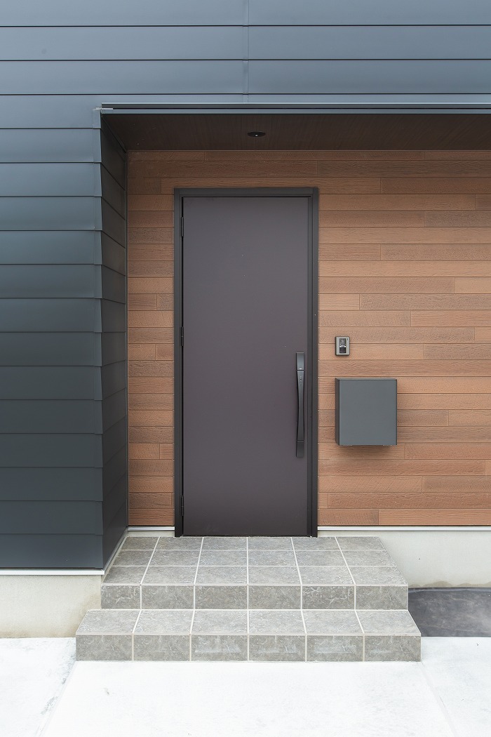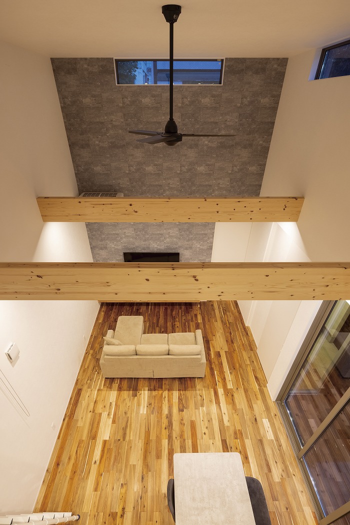 厚みのある石張風の外壁とガルバリウムを使い、素材感の違いでインパクトのある外観に。内装も床材に無垢のアカシア、アクセントにコンクリート風の壁を使い、落ち着いた飽きのこないインテリアも印象的です。