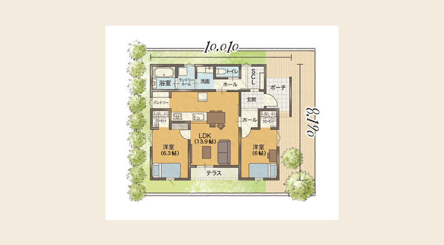 玄関から直接寝室へ、LDKからはホールを挟んで寝室に行く動線は、お互いを思いやる親子の暮らしにとって理想的な住まいです。