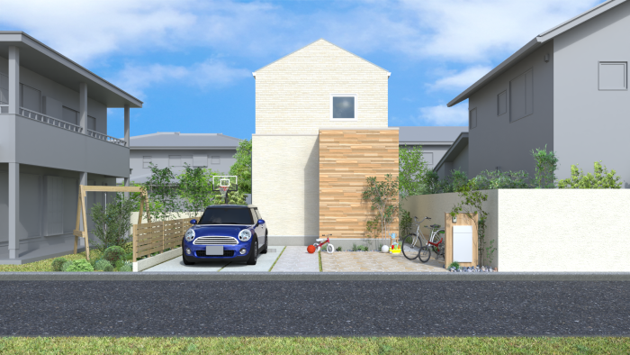 デザインはシンプルモダンなスタイル。 目立ち過ぎない外観デザインだからこそ、どんな街並みにも調和します。 また玄関前に設けたデザインウォールで、玄関開閉時に室内を覗かれないだけでなく、こどもの急な飛び出しなども防ぐことができます。